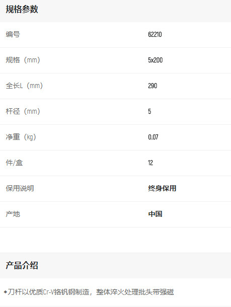 首頁>產品中心>螺絲批>一字螺絲批>世達A系列一字批5*200mm